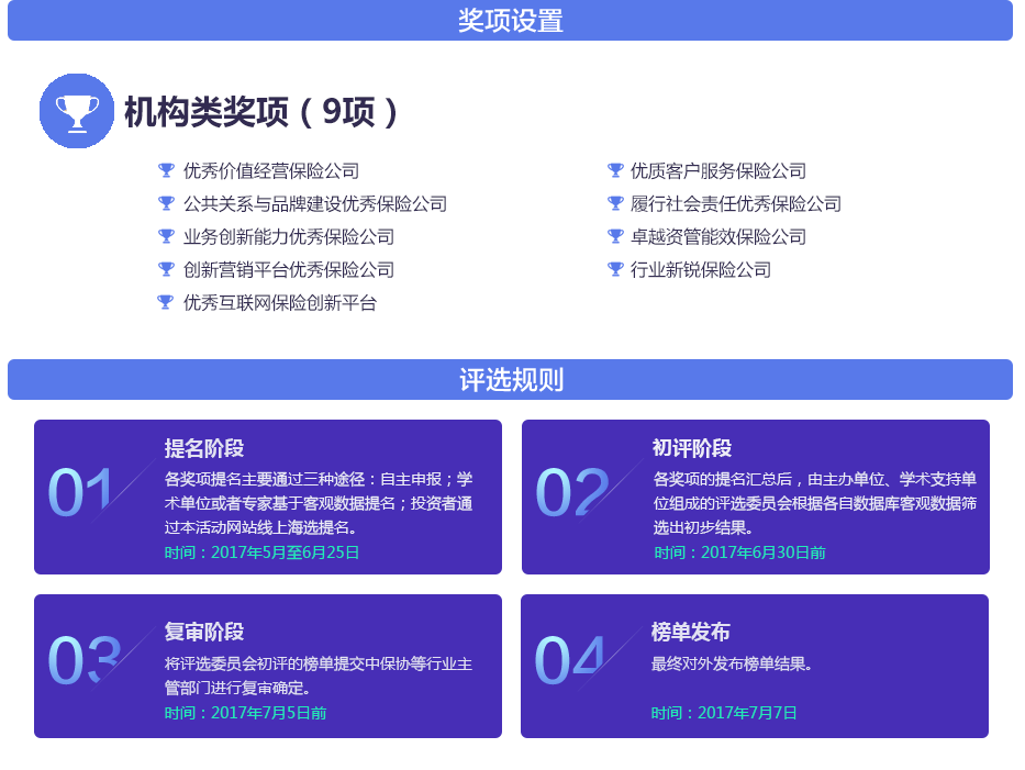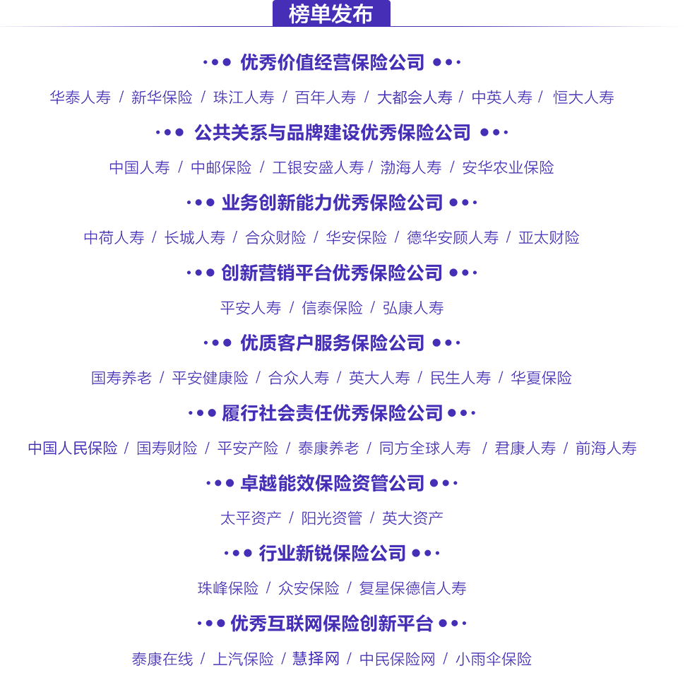 本次評選將秉持客觀真實、公正透明、范圍廣泛的原則,以“第5個保險公眾宣傳日”活動為契機,再次將視角聚焦于新生態(tài)環(huán)境下中國保險業(yè)最具經營智慧的風云企業(yè),力求準確把握保險風云脈絡。榜單以壽險、產險、資管為經度,以經營理念、品牌建設、業(yè)務創(chuàng)新、客戶服務、償付能力、社會責任、資管能效為緯度來設置獎項。